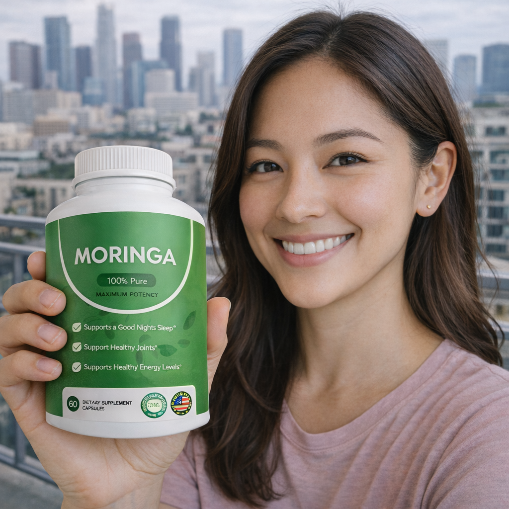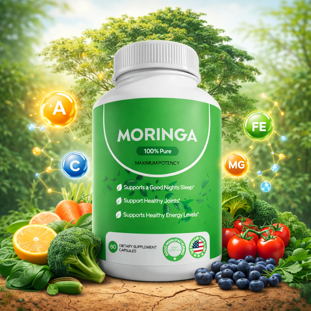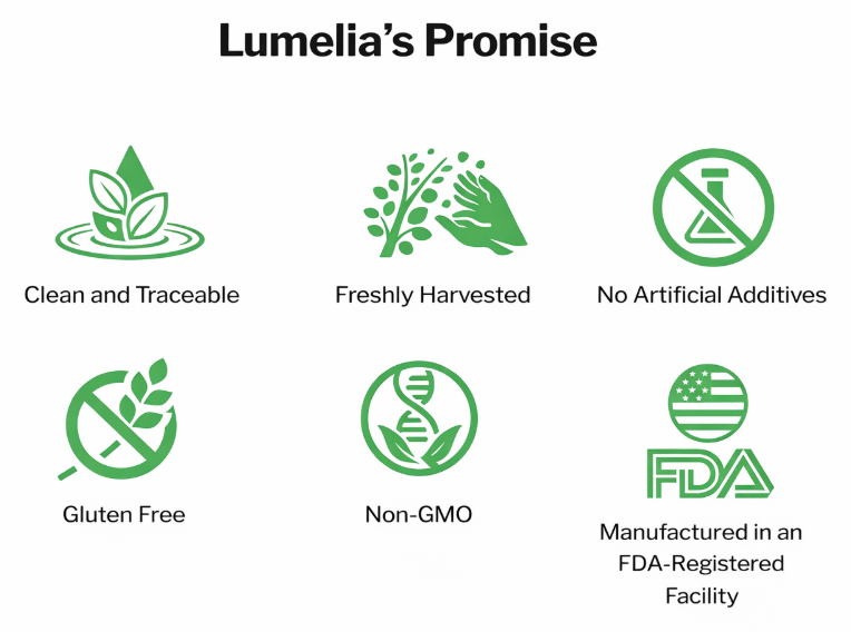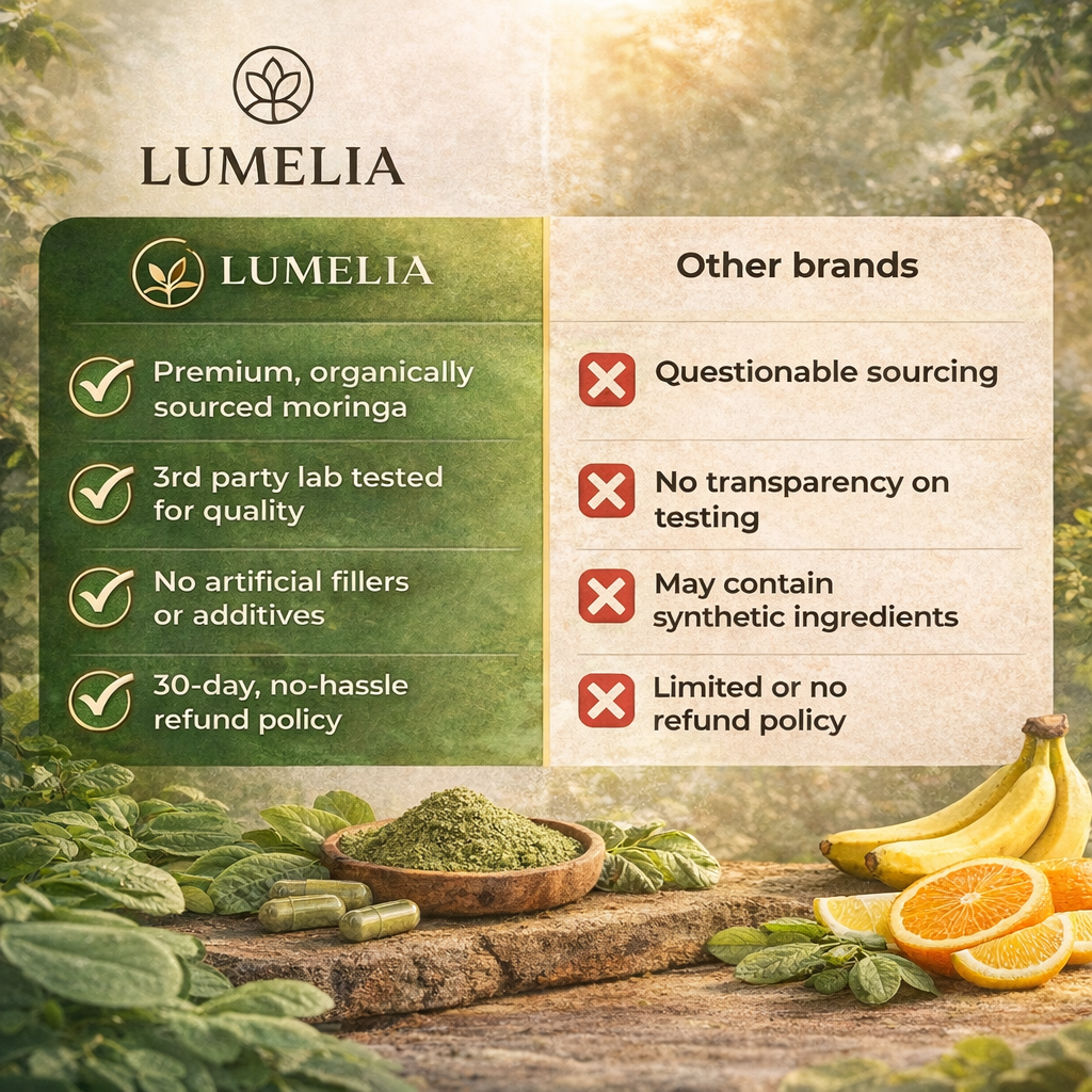 Lumelia™ Moringa Capsules deliver over 90 essential nutrients—including vitamins A and C, calcium, iron, magnesium, potassium, and antioxidants like quercetin—to help fill nutritional gaps in modern diets.